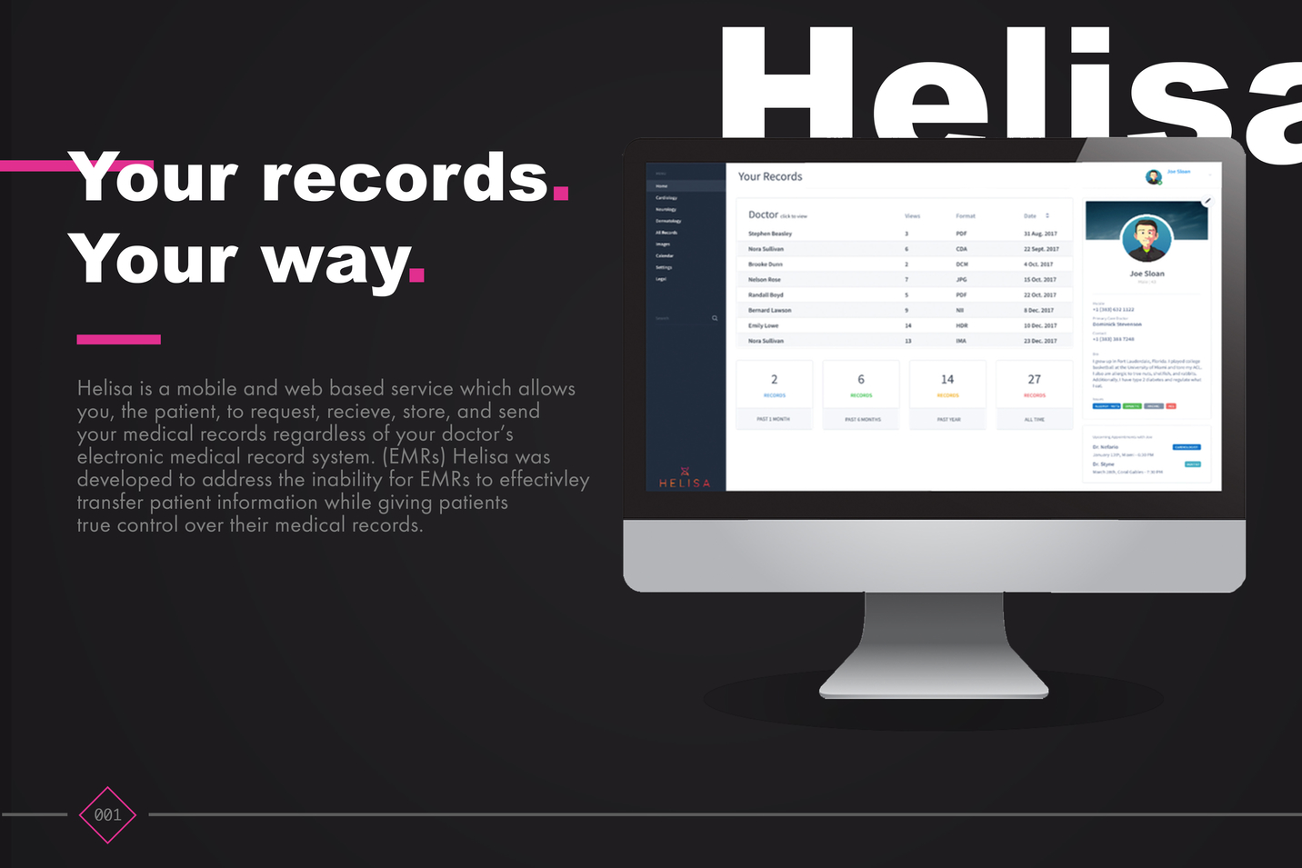 I am most proud of my work on Helisa, a personal health record manager which accepts, standardizes, and sends health records to and from 450 out of the 650 major electronic medical record systems. Following my personal experiences having to carry my medical history due to the inability for my doctor and hospital's systems to effectively communicate, it was clear that a solution had to be developed.